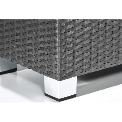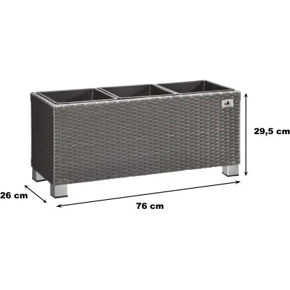 Der Pflanzkübel Polyrattan ist ein Pflanzgefäß für den Innen- und Außenbereich und setzt dekorative Akzente im Haus, auf der Terrasse oder im Garten. Das Pflanzgefäß ist aus einem hochwertigem PE-Kunststoffgeflecht hergestellt, das über einen rostbeständigen Alu-Rahmen gewebt ist. Die Faser ist UV- und temperaturbeständig, langlebig und pflegeleicht. Der Kunststoffeinsatz kann bequem außerhalb des Gefäßes bepflanzt und dann eingesetzt werden und bietet mit einer Größe von 24 cm x 24 cm x 24,5 cm ausreichend Platz. Gegenüber Einsätzen aus anderen Materialien bietet dieser den Vorteil, nicht zu rosten und absolut wasserdicht zu sein. Bei Außenaufstellung einfach ein Loch in den Boden bohren, um Staunässe zu vermeiden. Das Pflanzgefäß ist mit dekorativen Aluminium-Füßen versehen.