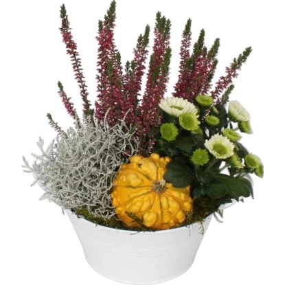 Dieses wunderschöne Arrangement eignet sich hervorragend für die Dekoration von der Fensterbank, dem Balkon oder der Terrasse. Ob Chrysantheme (Chrysanthemum), Stacheldrahtpflanze (Calostephalus) oder Heide (Calluna) – alle diese Pflanzen verbreiten wundervolle Herbststimmung. Der Deko-Kürbis rundet das Arrangement stilvoll ab.