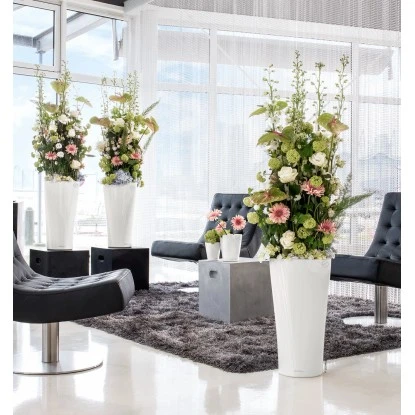 Der herausnehmbare Pflanzeinsatz mit Griffrahmen in Gefäßfarbe ermöglicht ein schnelles Wechseln der Bepflanzung. Im Wohnraum oder im Büro bietet die fließende Gefäßform mit abgerundeten Ecken einen hochwertigen Rahmen für exquisite Pflanzenarrangements.